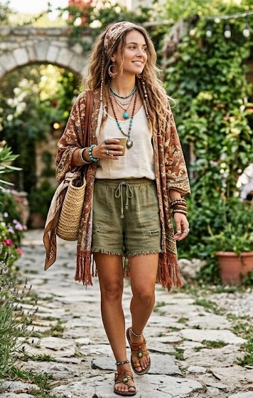 For a relaxed and artistic vibe, try a boho inspired shorts outfit. Pair loose-fitting shorts with a flowy top or kimono layer. Earthy tones, soft prints, and textured fabrics like cotton or crochet enhance the bohemian aesthetic. Complete the look with strappy sandals and layered jewelry. This outfit feels free spirited and comfortable, making it perfect for festivals, beach outings, or relaxed evenings.