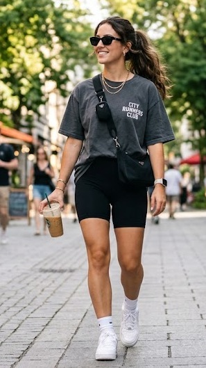 Biker shorts are no longer limited to workouts, they’ve become a stylish athleisure staple. Pair them with an oversized shirt, tunic, or longline top to create a balanced silhouette. This outfit is ideal for active days, travel, or casual outings. Sneakers and a crossbody bag enhance the sporty feel, while sunglasses add a trendy touch. The key is combining comfort with intentional styling for a chic finish.